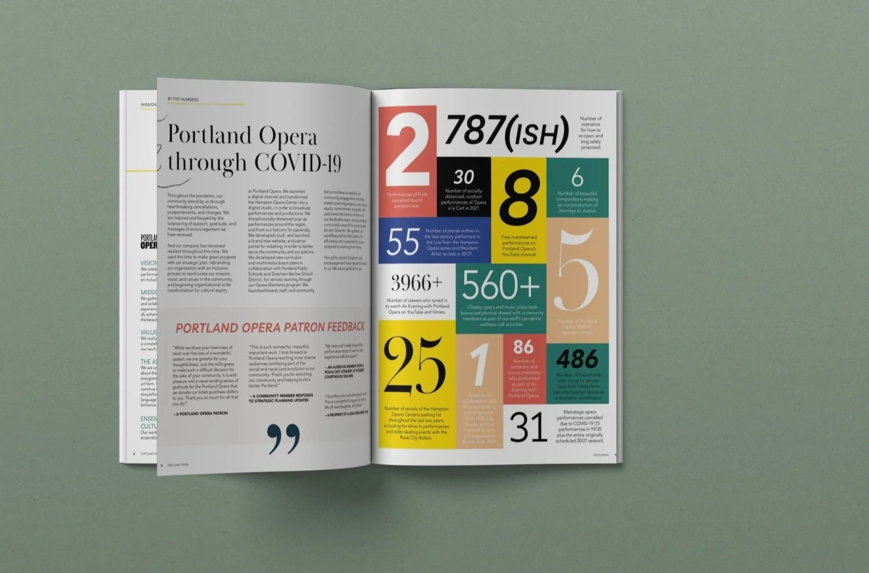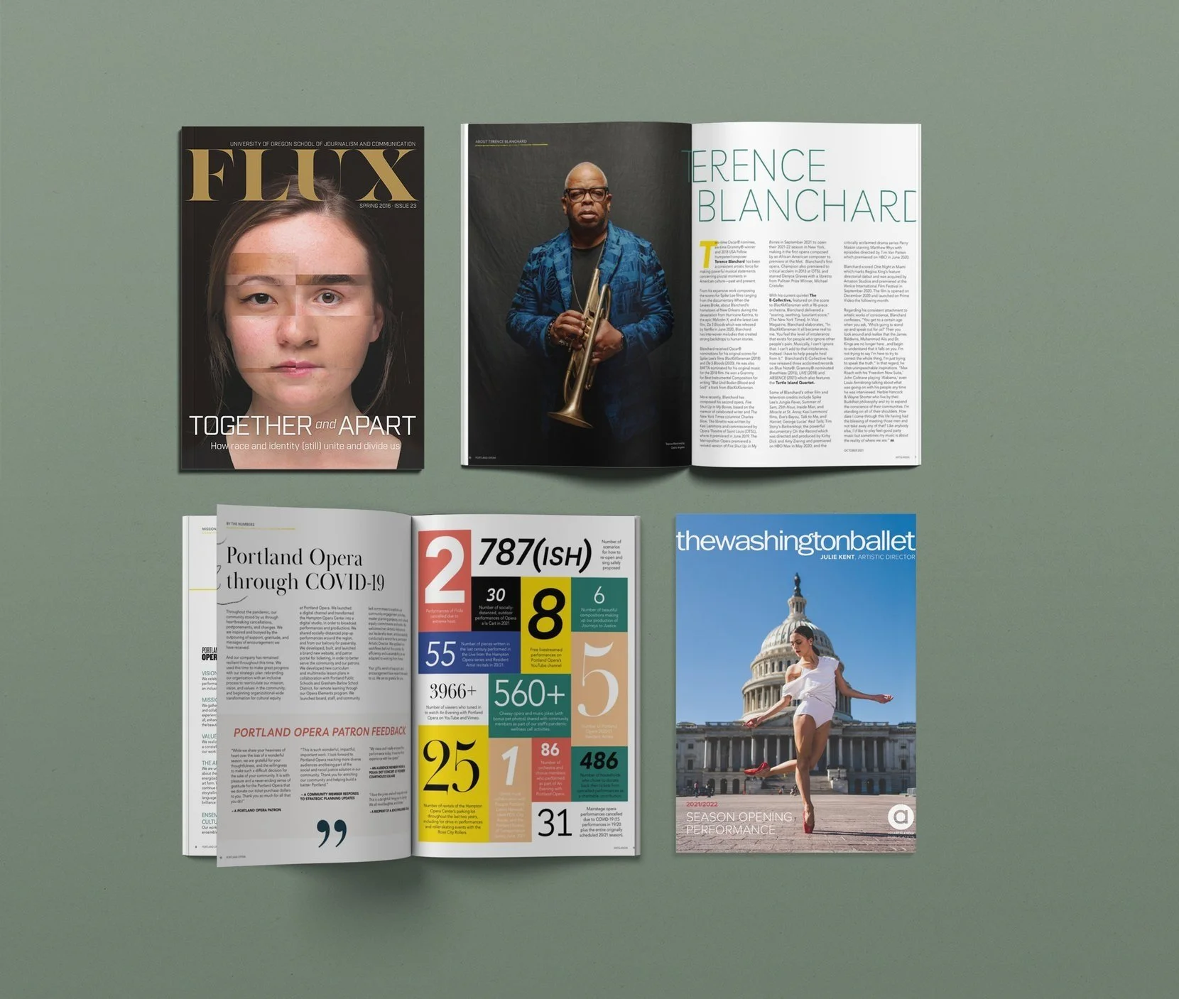 Portland Opera’s 2021 and 2022 issues of Toi Toi Toi as well as Sacramento Ballet’s Beer & Ballet, and The Washington Ballet’s first Season Guide with Artslandia, 2021